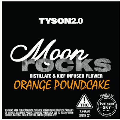 Southern Sky's "Tyson Orange Poundcake" 3.5g Moonrocks are a highly potent sativa-dominant cannabis product, produced as part of a collaboration with Mike Tyson's Tyson 2.0 brand. Moonrocks are made by taking a high-quality cannabis flower, coating it in potent distillate, and rolling it in kief to create a highly concentrated product.