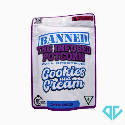 Banned Cookies and Cream Potcorn 200mg is a decadent THC-infused popcorn treat coated in creamy white chocolate and cookie crumbles. Its potent dose delivers a long-lasting euphoric high paired with deep, soothing relaxation.