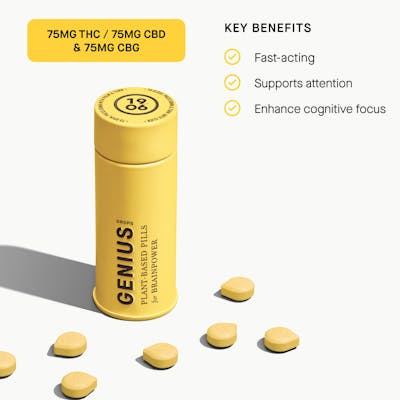 Genius promotes cognitive performance through a blend of cannabis, caffeine, and five plant medicines. Swallowable pills with rapid onset of 20 minutes. Vegan, calorie-free, sugar-free, and gluten-free.