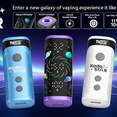 The Yocan Kodo Star is a compact and stylish 510-thread battery designed for use with most standard oil cartridges, delivering a balance of power, precision, and portability. Featuring a striking Galaxy full LED display that shows real-time voltage, battery level, and session information, the Kodo Star puts full control of your vaping experience right at your fingertips. It offers adjustable voltage from 1.8 V to 4.2 V in fine 0.1 V increments, so users can dial in the perfect setting for smooth, flavour-rich draws at lower voltages or warmer, more robust hits at higher levels. The device also includes a 10-second preheat function that runs at 1.8 V to help warm thicker oils and prevent clogging before use. Powered by a 400 mAh battery with fast USB-C charging, the Kodo Star fits easily in a pocket or purse while providing dependable performance throughout the day. With its universal 510 connection and intuitive controls, the Yocan Kodo Star is an ideal choice for anyone seeking precision, convenience, and vibrant style in a cartridge battery.