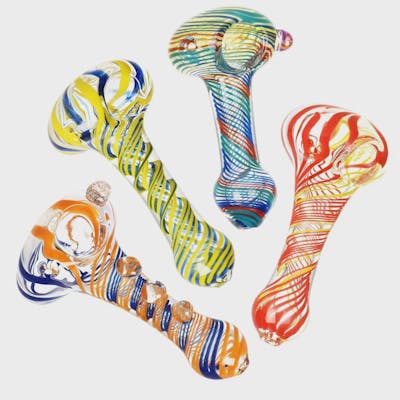 These spoon style pipes measure approx. 4 inches long. Made from quality borosilicate glass, the pipes feature a spiral stripes design. Colors vary. Pipes are handmade, so sizes range from 3.75" to 4.5".