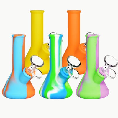 These 5 inch tall pipes are perfect for on the go, whether you're going for a drive or taking a hike. Made from durable silicone material, these beaker shaped water pipes include a 14mm male glass herb slide with a handle. Multiple colors available.
