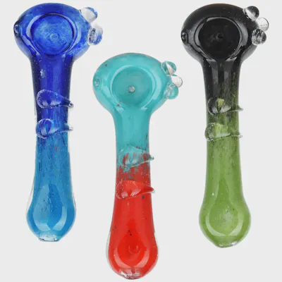These Unifying Theory Micro-Frit Spoon Pipes measure 5.25 inches (13.3cm) long. Made from quality borosilicate glass, these hand pipes feature a dual color micro-frit design with decorative marbles on the exterior. Colors vary.