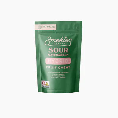 Smokiez Hybrid Sour Watermelon Fruit Chews are NOT YOUR AVERAGE FRUIT CHEWS™ These delicious Fruit Chews are a tasty and satisfying way for your customers to medicate! They are also Vegan, Gluten Free and dairy-free, and contain NO High Fructose Corn Syrup. Each of our mouth-watering Fruit Chews contains 10 mg of THC and is made with our high-clarity cannabis distillate for great taste. There are 10 pieces per package with 100 mg active THC per package.