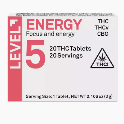 LEVEL 5 Energy Protab tablets are designed to provide a clean, focused energy boost. Each tablet contains 5 mg of delta-9 THC, 5 mg of THCv, and 3 mg of CBG, making them effective for enhancing productivity and concentration. These tablets are sugar-free, gluten-free, vegan, and contain zero calories, making them a convenient option for those seeking natural energy without the heaviness of sugary edibles. They are scored for easy splitting, allowing users to customize their dosage.