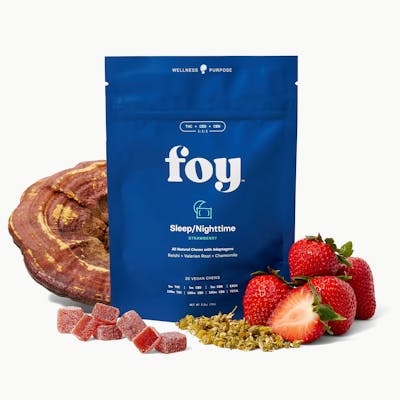 Elevate your nightly routine with a healthier alternative that surpasses the standard gummy. Foy Nighttime vegan soft chews are consciously formulated with authentic non-GMO fruit purées, delicately coated in powder derived from natural strawberries, and enriched with a potent adaptogen blend of USDA Certified Organic Reishi mushroom, USDA Certified Organic Valerian Root, and USDA Certified Organic Chamomile. These CO2-extracted, CBN-enriched chews are specially designed to promote optimal sleep quality and help reestablish a harmonious, restful sleep pattern. With 5mg of THC, 5mg of CBD, and 5mg of CBN per chew, Foy Nighttime Chews offer an unparalleled 300mg of total cannabinoids, elevating your nighttime routine to bring you the gift of rejuvenating slumber.