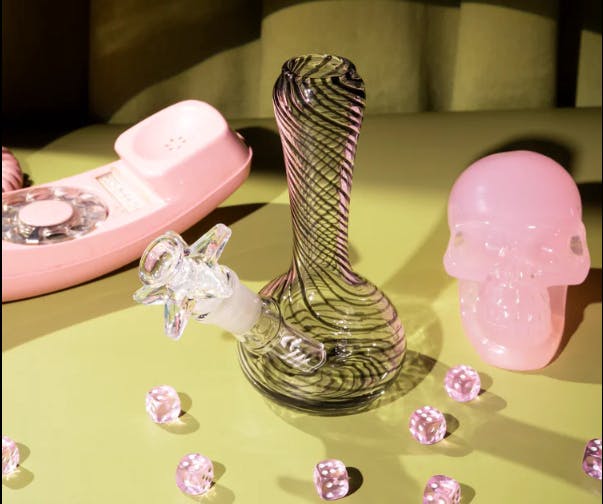 This bong is watching you... and it wants to be added to your cart! This cutie bong features a swirly black pattern from top to bottom! The neck has a unique graduated shape that feels super sturdy in your hand - perfect if you're accident prone like us. She even comes with a cute iridescent star slide! Just fill her with water and she's ready to go. Features: a 14mm star slide that is compatible with the slides on our site <3 a removable 2.25" downstem with inline perc gorgeous black swirl design! made of borosilicate glass measures 6.25"