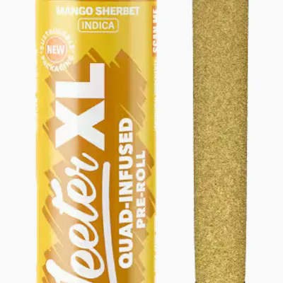 Mango Sherbet - IndicaMango Sherbet is an indica cross between Mango Trees, Mango Kush, and Sherbert. It grows fluffy, resinous buds that produce a fruity aroma of mango and sherbet. Mango Sherbet keeps you motivated, making it an ideal strain for an afternoon adventure or creative escapes.Jeeter’s Quad Infused Prerolls combine four layers working in sync for a maxed out infused experience. THCA diamonds add potency, rosin brings smooth, full spectrum depth, expertly crafted terpene profiles help shape the entourage effect while enhancing aroma, and a kief finish adds strength with a hand crafted touch. The result is a harder hitting experience with richer flavor that lasts longer.* Infused w/ THCA diamonds and rosin, dusted in kief* 2g XL Quad-Infused Joint w/ glass tip