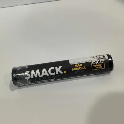 SMACK. | Donut Hole Infused Pre-roll | 1G SINGLE Full flower infused with a strain-specific terpene concentrate core. These infused joints deliver powerful, fast-onset flavor expression with smooth airflow and reliable performance. Flavor Profile: Mad Mimosa presents vibrant citrus alongside warm spice and herbal hops. Floral sweetness softens the edges, creating a zesty, uplifting, and aromatic profile. Dominant terpenes: d-Limonene, β-Caryophyllene, α-Humulene, trans-β-Farnesene, α-Bisabolol Effects: This sativa delivers an energetic and mood-brightening high with sharp mental clarity. Ideal for creative tasks, daytime exploration, or maintaining an active, upbeat pace. Key Features: Crown Wick™ – Even perimeter ignition for smooth, reliable lighting PLR Tip™ – Path of Least Resistance Tip channels airflow to eliminate start-up runs Infused Concentrate Core™ – Composed of strain-specific terpene concentrate AIR PAK™ + S.P.A.™ Tech – Eliminates canoeing while maintaining steady, smooth airflow Heat Curve Efficiency – Vaporizes cannabinoids and terpenes at optimal temperature for maximum effectiveness