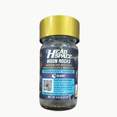 Permanent Marker Moonrocks pack a terp-rich punch that’s as bold as its name. Expect layers of candy sweetness, floral gas, and that signature permanent marker nose, all wrapped around sungrown flower dipped in distillate and dusted in kief. Perfect for kicking back after a long day. Effect: Sleep Tasting Notes: Floral · Sweet Candy · Gassy Funk THC: 23.07%