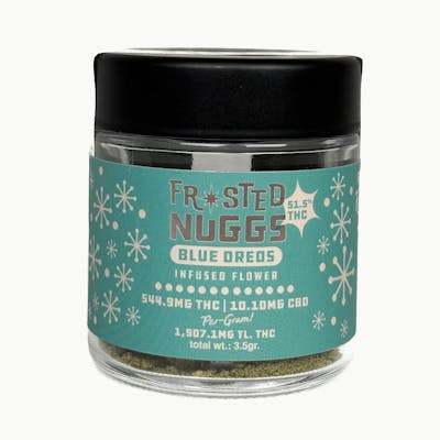 Blue Oreo Frosted Nuggs from Kiefers are buds evenly coated with distillate and kief. Blue Oreo is a hybrid with a happy, relaxed, and giggly high. The flavor profile is fresh fruit, berries, citrus, hops & pine. Break it up and roll or pack in a bowl!