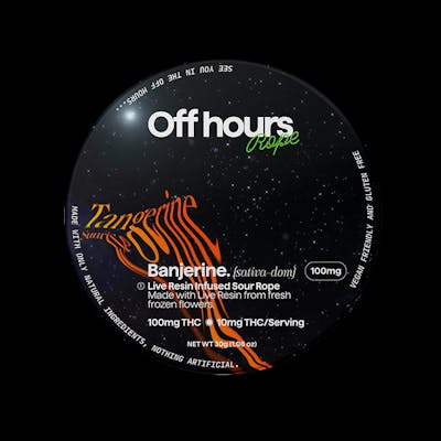 Banjerine Live Resin Infused Rope Flavor: Tangerine Sunrise (sour) Size: 1ct Strength: 100mg THC (10mg/serving) Species/Type: Sativa-dominant hybrid Lineage: Banjo x Cotton Candy Effect: Happy, Energized, Creative Flavor: Yuzu Tangerine with a splash of Pineapple Pairs well with: Exercising, Socializing Suggested use: Start with 1/2 of a section. Wait 1 full hour before increasing dose. Ingredients: organic cane sugar, reverse osmosis water, organic tapioca syrup, organic fruit juice from concentrate, fruit pectin, organic fruit flavoring, natural food coloring, MCT oil, cannabis extract, soy extract, terpenes, malic acid Alt description: Off Hours sour Tangerine Sunrise ropes are infused with Banjerine Live Resin for an energizing, social high. Each rope is naturally flavored with yuzu, tangerine, and a splash of pineapple to complement citrusy Bangerine.