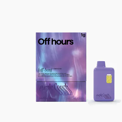(Off-box) + Diamonds (indica-dom) Strain: Purple Couch Kush Effect: Peaceful, Relaxing Flavor/Aroma: Grape, Kush Size: 1g Strength: 90% THC (900mg) Off Hours’ all-new off-box all-in-ones deliver concentrated potency in a hard-hitting, compact design. Formulated with cannabis-derived terpene blends and melted THCA diamonds for powerful, true-to-strain effects in a postless + rechargeable all-in-one. Usage Instructions: Take one, three-second draw as a single dose. AIO Device Instructions: This device is inhale activated. Recharge with a USB-C cable. Optimal charge time is 30-60 minutes. Battery Capacity: 300mAh Coil Resistance: 2.0O Output Voltage: 2.8V