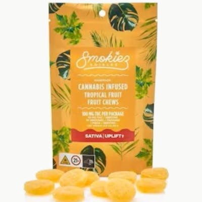 Enhanced with botanical terpenes! Smokiez Sweet Tropical Fruit Chews are NOT YOUR AVERAGE FRUIT CHEWSâ„¢ ;) These fruit chews taste like a mesh of fresh tropical fruits, with a balance of sweetness and fruity notes. These delicious fruit chews are a tasty and discreet way for you to indulge! They are also made with plant-based ingredients, dairy-free, and contain NO high fructose corn syrup. Each of our mouth watering fruit chews contain 10 mg of THC, and made with our high clarity cannabis distillate for great taste. There are 10 pieces per package with 100 mg active THC per package. Smokiez 100mg THC Fruit Chews come in 3 delicious flavors and have both sweet and sour flavor profiles