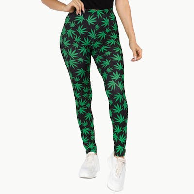 Blazing Style & High Comfort Made from a blend of 92% Polyester and 8% Spandex, these high-waisted leggings are soft, comfortable, and conforming to your curves. These leggings are all black with green print all over which feature a pot leaf. The high-waist elastic waistband lets you wear whatever you want on top, no matter how short; and with such a high waistband you can feel free to bundle and tuck it however suits you best. Leggings are one size fits most.