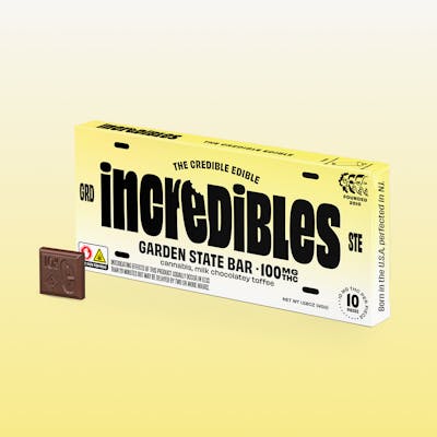 Born in the U.S.A., perfected in N.J. This New Jersey fave is coming down the ’Pike (no tolls required). Buttery toffee and pure, milk chocolatey joy. Made with 100% pure cannabis oil in a perfectly blended mixture to ensure accurate dosing and consistency. Perfect for exploring the Garden State. Featuring a precision-dosed confection collection with yummy flavors and delicious effects, you can trust incredibles to be the credible edible. Potential effects: Promotes emotional well-being Serving size: Standard serving is a single square (10mg THC per piece). Bar contains 100mg THC molded into 10 equal segments. Onset & duration: Onset may take up to 2 hours. Duration can last up to 3+ hours. Effects vary by individual. Estimates are based on a standard serving. Contents: Made with pure THC oil and evenly blended for consistency. Allergens: Milk, soy, almonds. Made in a facility that processes tree nuts, peanuts, milk, soy, eggs, coconut and wheat. Ingredients: Milk and dark confectionery coating, toffee bits, palm kernel oil, cannabis extract Storage: Keep in original sealed container between 60°F - 80°F. Avoid conditions of high humidity and temperature. Keep out of direct light and do not store in hot car.