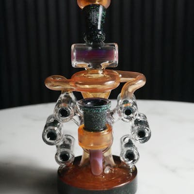 The Aura V2 is a true embodiment of Evol Empire’s commitment to pushing the limits of functional glass design. At the heart of this iteration lies a bold structural evolution—seven fully functional dewars, made possible by the innovative “open” and “aligned” wraparound style. This architectural approach doesn’t just look visually stunning; it enhances stability, airflow distribution, and overall structural integrity. Every pathway is intentional, and each dewar serves a purpose, contributing to an incredibly smooth, balanced recycling action that delivers consistent, flavorful pulls without sacrificing form. One of the standout advancements in the V2 model is the introduction of the jacketed joint, a thoughtful upgrade that increases heat resistance, strengthens the joint connection, and adds another layer of durability for those who expect longevity and performance from their glass. The entire piece is designed with ultimate functionality in mind, yet it never feels overbuilt or cumbersome—balance and flow remain central to the design philosophy, making the Aura V2 not only an artistic statement but a practical daily-use rig for seasoned connoisseurs. While an official Aura V2 Eclipse Crushed Opal Galaxy Recycler hasn’t been formally catalogued or released online, its existence—whether as a rare concept or collector's prototype—speaks volumes about Evol Empire’s forward-thinking creative vision. The combination of the Aura platform, the Eclipse engineering, and the shimmering crushed opal galaxy finish is a near-mythical fusion of performance and cosmic aesthetic. Pieces like this often exist outside standard production runs, possibly custom-built for collectors or events, making them incredibly rare and desirable among the glass art elite. { Features: Orange - Black - Purple | Rare Aura V2 Eclipse Crushed Opal Galaxy | Unique Function } { Specifications: Height: 8in | Base Width: 4.5in }