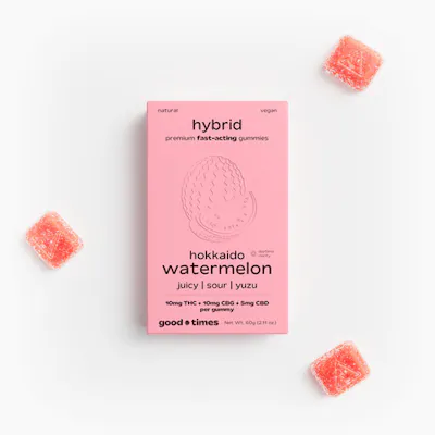 Good Times Hokkaido Watermelon Edibles offer a juicy and refreshing flavor inspired by sweet watermelon. The terpene-inspired profile delivers a smooth blend of ripe melon sweetness with a light, refreshing finish. These edibles are crafted for consistency and flavor, providing a reliable cannabis experience with each serving. The soft texture and vibrant taste make them an easy and enjoyable option for both new and experienced consumers. Hokkaido Watermelon typically produces uplifting and calming effects that create a relaxed and happy state. It’s a great edible for casual enjoyment or unwinding with a refreshing flavor.