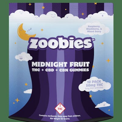 Zoobies Midnight Fruit Gummies are formulated for deep relaxation and restful sleep. Infused with THC and added CBN, these rich, dark-fruit flavored gummies—think blackberry, plum, and blueberry—are your nighttime go-to. They taste like dessert and wind you down without the grogginess. Designed to help quiet the mind and calm the body, these gummies ease you into a smooth, steady state of chill. Within an hour, tension melts and your thoughts slow, setting the stage for restful sleep. Whether you struggle with falling asleep or staying asleep, Midnight Fruit Gummies help make the transition easier. Dosed for reliability and crafted for taste, Zoobies Midnight is a functional edible that doesn’t sacrifice flavor or quality. Ideal for winding down, not zoning out.