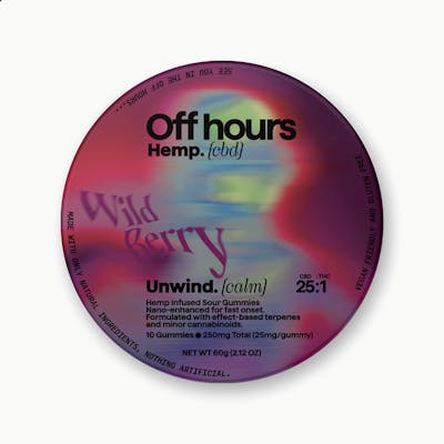 Flavor: Wild Berry (Sour) Terpenes: Special Blend for Relaxation Size: 10ct Strength: 250mg CBD (10mg/serving) + 10mg THC (1mg/serving) Unwind any time with Off Hours hemp infused Sour Wild Berry gummies specially formulated for deep relaxation. Nano-enhanced cannabinoids for fast onset. Vegan and gluten free Suggested use: Start with 1/2 of a gummy. Wait 1 full hour before increasing dose. INGREDIENTS: Organic Cane Sugar, Reverse Osmosis Water, Organic Tapioca Syrup, Organic Fruit Juice From Concentrate, Fruit Pectin, Organic Fruit Flavoring, Natural Food Coloring, MCT Oil, Hemp Extract, Soy Extract, Terpenes, Malic Acid