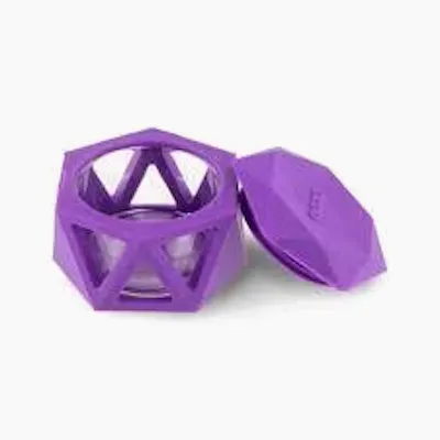 The Ooze Geode Dab Container in Purple is a compact, durable storage solution designed for concentrates, featuring a glass interior for material preservation and a protective silicone exterior.