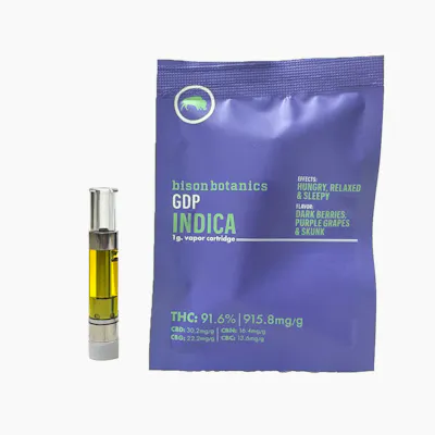 One-gram indica cartridges from Bison Botanics are formulated with high-quality terpenes offering relaxed and calming effects. Each cartridge has 825mg of total THC. Granddaddy Purple is an indica marijuana strain that goes by many different names, including "Grand Daddy Purp," "Granddaddy Purps," "GDP," and "Grandaddy Purple Kush." Popularized in 2003 by Ken Estes, Granddaddy Purple (or GDP) is a famous indica cross of Mendo Purps, Skunk, and Afghanistan. Other people claim it is Big Bud x Purple Urkle. Either way, this California staple inherits a complex grape and berry aroma from its Purps and Ghani heritage. GDP flowers bloom in shades of deep purple, a contrasting backdrop for its snow-like dusting of white crystal resin. Its potent effects are clearly detectable in both mind and body, delivering a fusion of cerebral euphoria and physical relaxation. While your thoughts may float in a dreamy buzz, your body is more likely to find itself fixed in one spot for the duration of GDP’s effects. Granddaddy Purple is typically pulled off the shelf for consumers looking to combat pain, stress, insomnia, appetite loss, and muscle spasms.