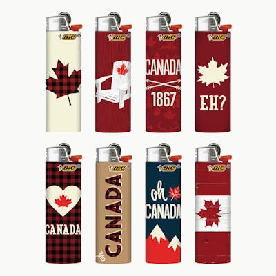 This tray of 50 Bic Maxi Classic lighters that feature an assortment of Canadiana designs that will keep your bong ripping and joints lit, in a very stylish way.