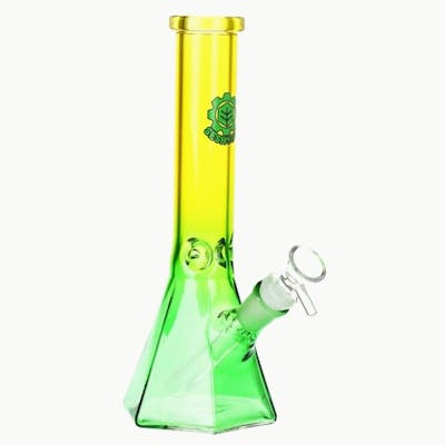 The SeshGear Prismatic Bliss Ombre Glass Water Pipe combines eye-catching ombre aesthetics with everyday functionality. Standing 10 inches tall, the yellow-to-green gradient shifts beautifully in light, creating a visually striking centerpiece for any glass collection. Crafted from premium borosilicate glass, this beaker-style water pipe features a stable base, diffuser downstem, and a 14mm female joint. Its design delivers smooth, filtered hits while maintaining a bold, playful look.