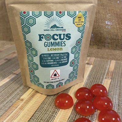 Lemon flavored focus gummies from Wind Hill Growers. 2mg THC, 20mg CBD, 5 CBG, 50mg Caffeine, 100mg L-Theanine, .25mg Vit B12, 3mg Ginseng