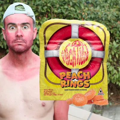 Hash Rosin Nano Gummies – Full Flavor, Fast Ride Vacation’s Hash Rosin Nano Gummies bring big flavor and even bigger vibes — fast. Each tin holds 20 mouthwatering gummies, each infused with 10mg of fast-acting, solventless hash rosin for a total of 200mg THC. Smooth, potent, and always ready for lift-off, Vacation Gummies are your all-access pass to quicker, better highs. Peach Ring – Ring in the Flavor Own the Moment. Juicy, sweet, and tangy with a peachy punch that hits just right. Peach Ring brings bold flavor and a smooth, feel-good lift to keep your vibe high and your day brighter. No fuzz. All fun. Pure peach power.