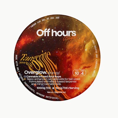 Off Hours Tangerine Sunrise Overglow ropes are the perfect pick me up throughout your day. Specially formulated with an energizing blend of THC and CBG for a happy, uplifting high. FLAVOR: Tangerine Sunrise (sour) SIZE: 1ct STRENGTH: 100mg THC (10mg/serving) | 40mg CBG (4mg/serving) Effect: Energy