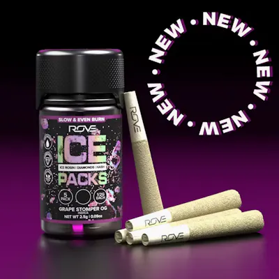 Rove Ice Packs, the world’s first triple-infused preroll. Made with premium-grade flower fully-infused with THCA diamonds and solventless ice hash rosin, they're expertly rolled, then coated with more ice hash. Super smooth and ultra potent, Rove Ice Packs test at over 50% THC. Welcome to the next evolution of prerolls. -- Drift into tranquility with Grape Stomper, a soothing indica preroll that gently merges mind and body. This carefully crafted blend slowly unwinds tension, easing your mind into a dreamy haze. Perfect for when you need to unplug and drift off. 5 pack | 0.5g each preroll Flavors Grape Diesel Pepper