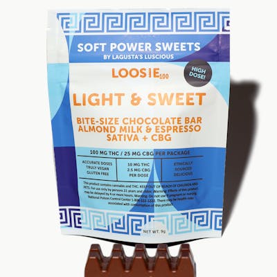 Our Light & Sweet Loosie is a take on the classic NYC bodega coffee order. The “light” is the creamiest almond milk chocolate, the “sweet” is raw sugar + espresso. A natural kick of caffeine and CBG make it a new morning ritual. Ingredients: almond milk chocolate (vegan sugar, cocoa butter, cocoa beans, ground almonds, sunflower lecithin, natural vanilla extract), espresso, cannabis extract