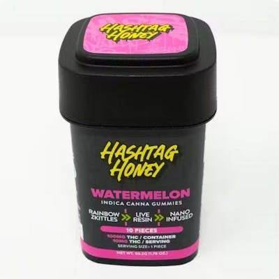Watermelon | Live Resin Nano Infused | 10mg Per Piece, 100mg Per Package Hashtag Honey Live Resin Nano Infused Gummies available in Blue Raz, Tropical Punch, Green Apple and Strawberry. Fast acting and potent perfection that are bursting with natural flavor. Effects: relaxed, sleepy, happy