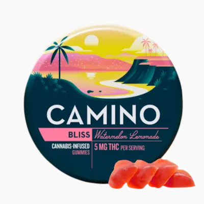5mg THC per piece | 100mg THC in 20 pieces A physical road takes you to a physical place. Camino (“road” in Spanish) takes you to a state of mind. Settle in for a smooth slumber in a cozy lake cabin and let all your worries go. Find yourself on a blissful beach with our 'Bliss' Watermelon Lemonade gummies. Let sativa and indica terpenes alongside juicy watermelon and tart citrus welcome you to your happy place.