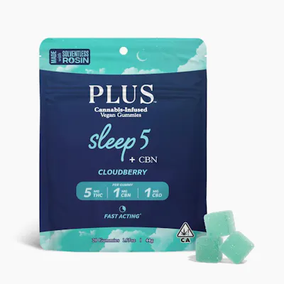 One bite and it’s goodnight! New & improved PLUS SLEEP Cloudberry Nano Gummies are the first Dual Action edibles to combine fast-acting and long-lasting formulas in one product. Fall asleep quickly with 5mg of our cutting-edge, nano emulsified THC which provides rapid onset in just 8 minutes! Stay asleep longer with the powerful sedating effect from our blend of CBN, CBD, and 10 sleep terpenes delivered via extended-release technology. Enjoy mild psychoactivity as you drift off to dreamland and wake up feeling refreshed! Made with 5mg of THC, 1mg of CBN, and 1mg of CBD per piece and all-natural flavors and colors. Each gummy contains less than 1g of sugar and only 5 calories. 20 servings per container. 100mg THC and 20 mg CBD. Ingredients: Glucose, sugar, distilled water, kosher gelatin, natural flavor, cannabis emulsion (water, coconut oil, quillaia extract, citric acid, mixed tocopherols [vitamin E] potassium sorbate and sodium benzoate [as preservatives], gum acacia), malic acid, citric acid, natural color