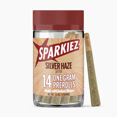 Description A classic, energizing sativa, Silver Haze delivers a bright, cerebral high that’s perfect for daytime use. Known for its sharp and refreshing terpene profile, expect flavors of citrus, pine, and subtle spice with a clean, uplifting finish. The effects are fast-acting and mentally stimulating, promoting focus, creativity, and an overall sense of motivation without heavy body sedation. Crafted with premium, strain-specific flower—never trim or shake—Sparkiez prerolls are rolled for consistency, quality, and a slow, even burn every time. Each pack contains 14 prerolls totaling 14 grams. Each preroll contains 1 gram of flower. Effects: Uplifted, focused, energetic Flavors: Citrus, pine, spice (License# CDPH10004780) (License No.CDPH10004780 )