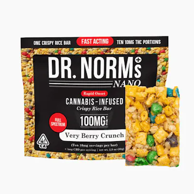 Experience Dr. Norm’s Fast-Acting Nano – our line of cannabis baked goods that have greater bioavailability than traditional edibles. This means faster acting as well as more potent! In fact, you may feel the onset of our Fast-Acting Nano products in as little as 15 minutes. We’ve also added back several minor cannabinoids like CBD, CBN and CBG which provide additional benefits via the entourage effect. Our crunchy, chewy, Very Berry Crunch Bar features the classic taste of the Captain Crunchberry Cereal combined with velvety melted marshmallows, butter and our secret ingredient. These yummy treats literally melt in your mouth and will have customers coming back for more. Comes with a custom cutting grid for portioning into 10mg doses. (License No. CDPH-10003615)