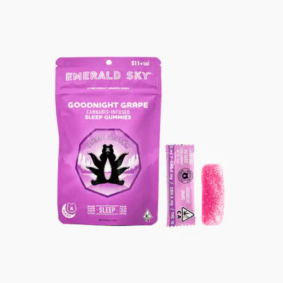 Goodnight Grape gummies by Emerald Sky are the perfect way to unwind and relax before bedtime. Each gummy contains 10mg of THC, 4mg of CBN, and 2mg of CBD, providing a balanced combination of cannabinoids to help you achieve a peaceful night's sleep. The delicious grape flavor adds a tasty twist to your nightly routine, making it a treat to look forward to. With the calming effects of THC, the sedative properties of CBN, and the soothing benefits of CBD, these gummies are specially crafted to reduce sleeplessness and improve restfulness. Say goodbye to restless nights and hello to a more rejuvenating sleep experience with Goodnight Grape gummies. Try them today and experience the difference for yourself! (License No. CDPH-10002851)