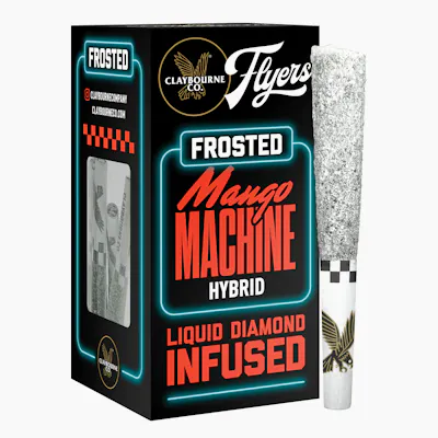 Frost Around & Find Out! These super tasty half gram pre-rolls are THCa Diamond Frosted, Terpene Enhanced, and made from Premium Indoor, Full Nug Flower Infused with Liquid Diamonds. Each Frosted Flyer is highly potent and packed with nonstop flavor all the way down to the crutch. Go for a spin on this fine tuned Mango Machine! This hybrid strain offers superior performance and handling with its balanced effects, giving you both a cerebral rush and a euphoric body buzz to get you cruising through the day. Its Mango flavor keeps the ride going all the way down to the crutch with gas and OG notes that will keep you pumped till your next joyride!
