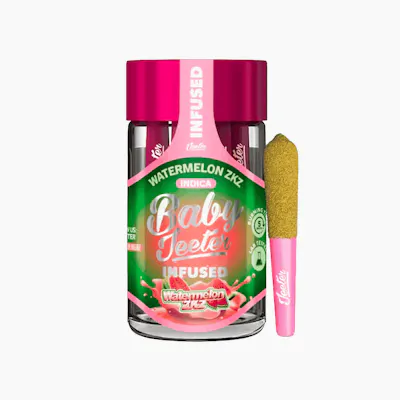 Watermelon Zkittlez Baby Jeeter Infused - Indica: a good night sleep, blissful, relaxing, soothing, strong body high, calming, sleepy, unwind, melt away stress. Contains five 0.5g prerolls. Weight: 2.5g (License No. CDPH-10003525)