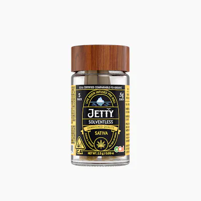 Sweet meets sour in the best way. Strawberry Kush and Razzberry deliver that juicy, full-body calm, while Tropicana Cookies layers in zesty citrus energy that stays mellow, not racy. We start with OCal Certified (comparable-to-organic) top-shelf bud, selected for its flavor and potency. An infusion of live rosin comes next, made in-house using just ice, water, heat, and pressure. The result is unique pairings that bring out intense flavors and effects from complementary flower and hash terpene profiles. It’s a full-spectrum, full-body high that delivers. Top-shelf bud. Curated flower and oil pairings. Supercharged Potency. Find your flavor with Jetty Pre-Rolls. C11-0000374-LIC