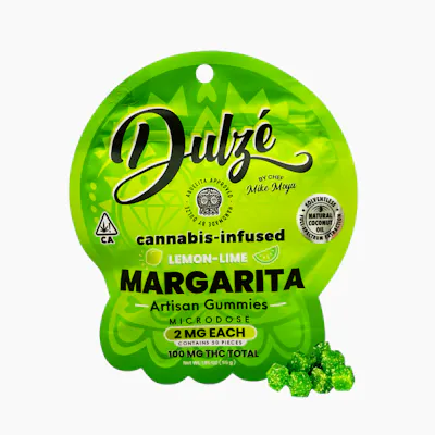 Dulze Margarita Gummies — Dulze shakes things up with a tangy twist on a classic cocktail. These zesty gummies blend bright citrus flavor with a hint of salt and 2mg THC per piece from full-spectrum coconut oil for a smooth, relaxing buzz. With 50 servings per bag, they’re perfect for a light lift or sharing good vibes. Ingredients: full spectrum coconut oil extraction, granulated sugar, light corn syrup, kosher gelatin, citric acid, natural & artificial flavors, FD&C Yellow 5, Blue 1. Gluten-free, dairy-free. (Licenses: DCC-10004881; C11-0001630-LIC)