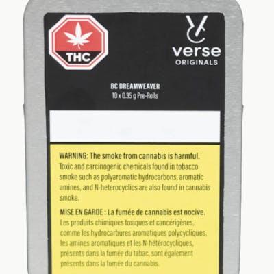 Meet BC Dreamweaver Pre-Rolls by Verse Originals - the Verse series is an affordable, high potency offering of quality BC buds. Our pre-rolls are made from BC Dreamweaver flower, an indica-dominant strain with a flawless grind and pack for an enjoyable, steady burn. The aroma consists of citrus fruits and tastes of fresh, earthy berries produced by lead terpenes: beta-caryophyllene, myrcene, alpha-bisabolol, alpha-humulene and linalool. Each tin comes with 10, 0.35g pre-rolls using unbleached, natural brown paper and comes in a resealable, metal container.
