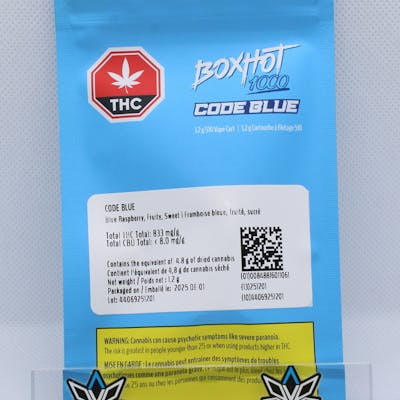 "BOXHOT PRESENTS: Code Blue, a 1.2 g hybrid 510 vape with a colossal 1000 mg of THC and some of the purest cannabis distillate available on the market. Brace for the sweet release with a steady blue razz rhythm and a burst of fruity flavour to kickstart your tastebuds. All BOXHOT vapes are made with exclusive, oversized hardware, making them optimal for big, full hits. Best of all, BOXHOT vapes are produced using industry-leading CO2 extraction and refining processes and feature a custom blend of expertly infused botanical terpenes."