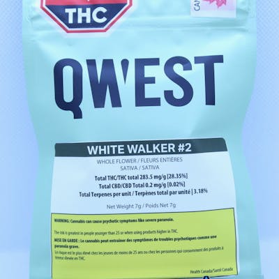 "Walk this way - fast. White Walker #2 (White Widow x Skywalker) leans spicy and pine-forward with a citrus hit. It'll have you running back for more. Crafted with care. No shortcuts. Qwest flower is small batch, hang-dried, and hand-selected to preserve its flavour, potency, and terpene-rich aroma. No gimmicks - just trichome-caked buds with real character, made for those who know the difference. The truth is in the bag."