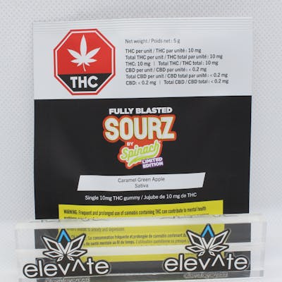 Prepare for blast off! Limited edition SOURZ by Spinach Fully Blasted Caramel Green Apple gummies are action-packed with 10mg THC per piece. Celebrate the start of sweater weather with buttery, sweet caramel and tart-green apple flavours! This dual-flavoured gummy is over-the-top with natural flavours and blasted with sour crystals. Enjoy 1 gummy per pack, 10mg THC total.