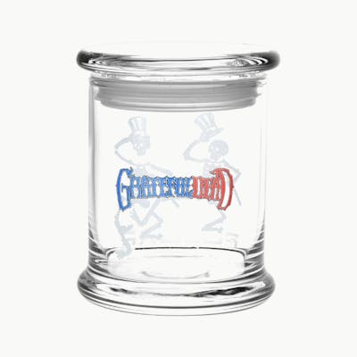 These Grateful Dead x Pulsar Pop Top Jars are perfect for storing herbs, medicine, spare change, and more! The jars feature a Top Hat Skeletons design with tap-dancing skeletons and a Grateful Dead logo. Each jar is fitted with an airtight plastic gasket on the glass lid to keep the contents fresh. These jars measure 4.5 inches (11.4cm) tall and hold up to 1/2 ounce of dry herb material.