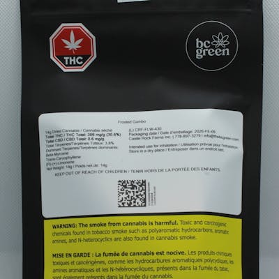 Frosted Gumbo is an indica-dominant cultivar with a marvelous gassy, vanilla nose. Having a sweet and intense flavor, Frosted Gumbo blends both sweet and spicy flavors, it's truly one of a kind! Top terpenes include Caryophyllene, Myrcene, and Limonene.
