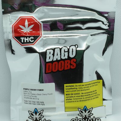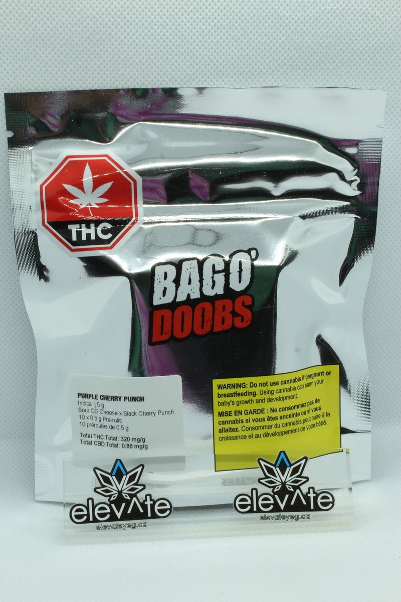 Purple Cherry Punch Bag o' Doobs offers 10 cone-style 0.5g pre-rolls, rolled with hemp paper for a smooth, premium experience. This indica is a cross of Sour OG Cheese x Black Cherry Punch, boasting sweet grape, berry, and floral aromas with dominant terpenes like ?-Caryophyllene, limonene, and humulene. It's a flavourful and chilled out choice for those who appreciate big flavour, quality and convenience.
